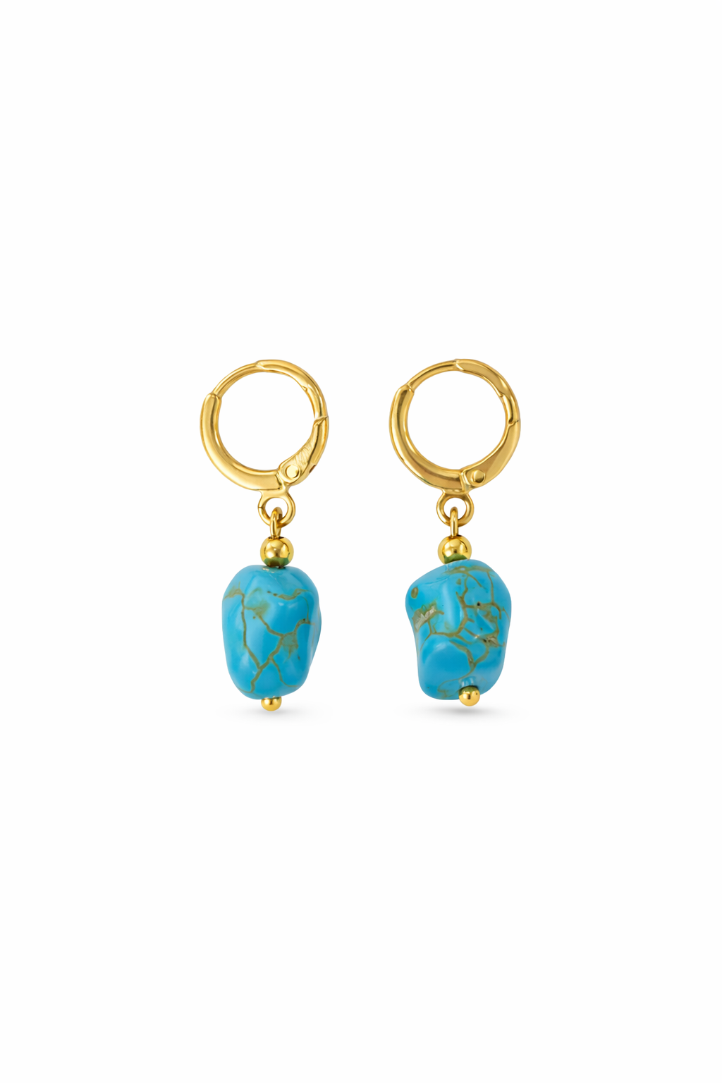 Brinco delicado com mini argola dourada e pingente em tom turquesa, inspirado nas águas cristalinas do oceano. A combinação do banho de ouro 18k com o azul vibrante da pedra cria um contraste sofisticado, que transmite frescor, leveza e elegância natural.