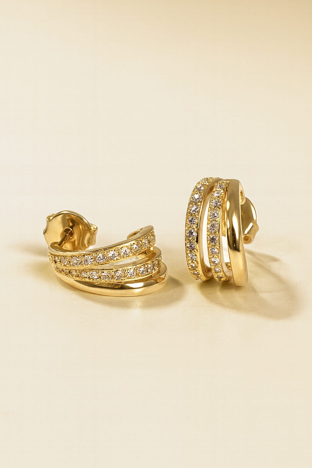 Brinco modelo meia argola com design triplo elegante, que combina acabamento liso com detalhes delicadamente cravejados em zircônias, criando um contraste sofisticado e moderno.