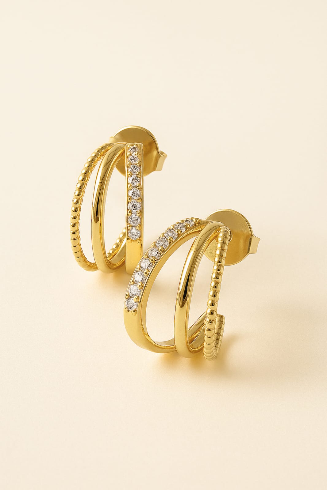 Brinco em formato de argola com design triplo, combinando três linhas harmoniosas: uma lisa polida e brilhante em ouro 18k, outra texturizada em ouro 18K e outra delicadamente cravejada com zircônias, que proporcionam brilho sofisticado à peça.