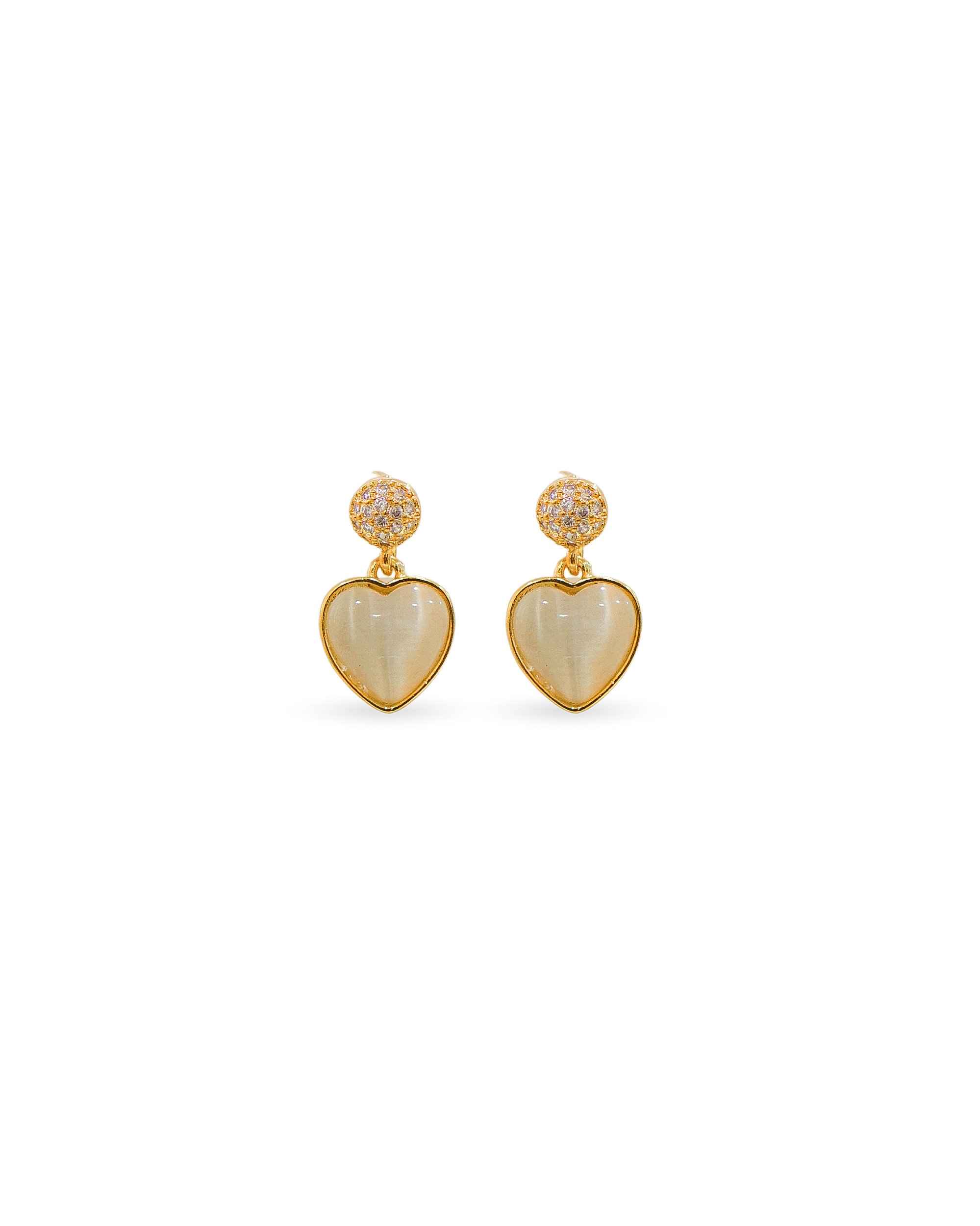 Este brinco apresenta um design pendente e romântico, destacando uma pedra em formato de coração com acabamento liso e brilho suave. A base superior é composta por um elemento circular inteiramente cravejado de zircônias brancas, que adiciona um ponto de luz sofisticado à peça e cria um contraste elegante com o pingente.