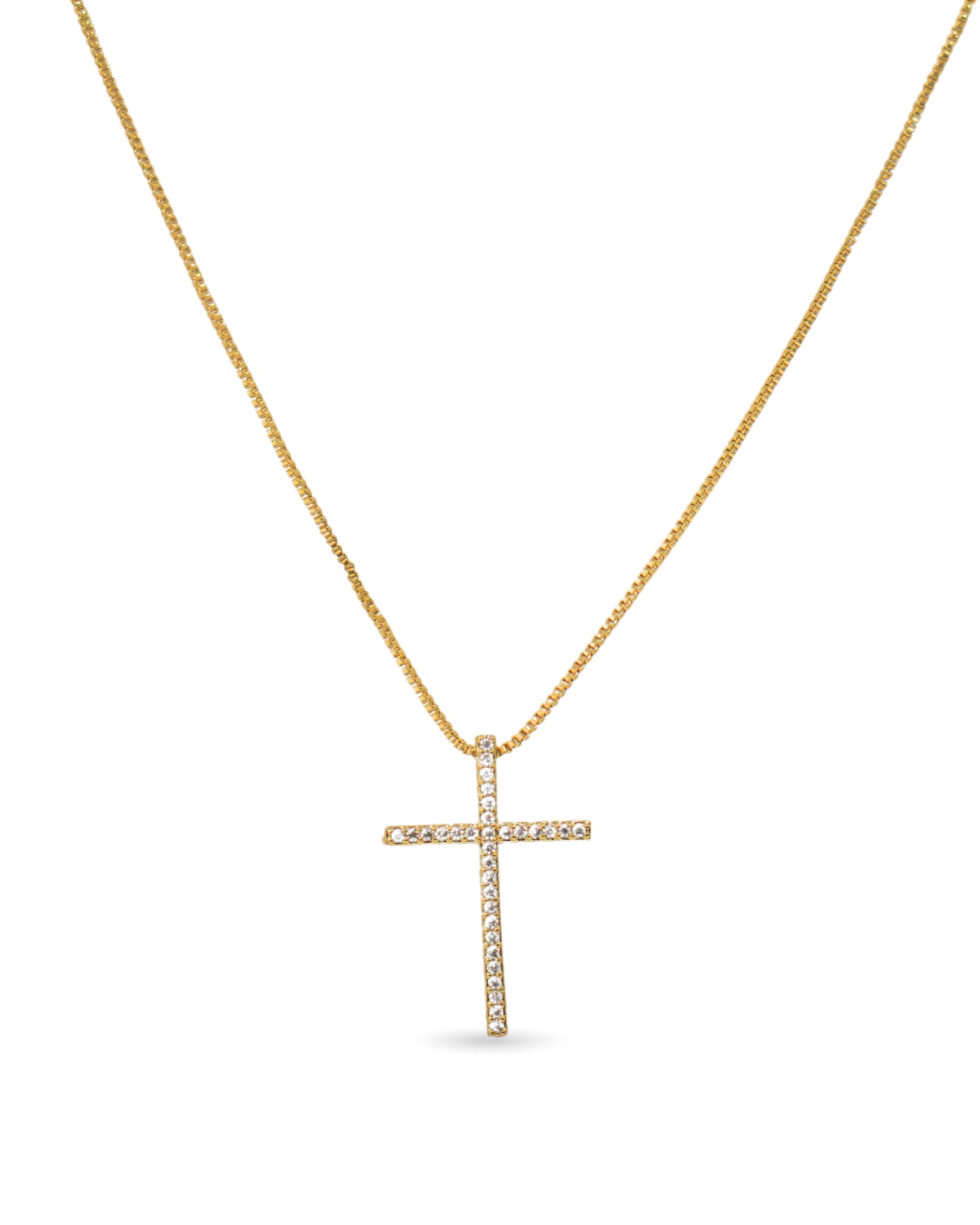 Este colar apresenta o símbolo da cruz, inteiramente cravejada de zircônias brancas que captam a luz de todos os ângulos. O pingente possui um design delicado e é acompanhado por uma corrente veneziana, conhecida por seus elos quadrados e brilho contínuo, proporcionando um acabamento refinado e de alta joalheria.