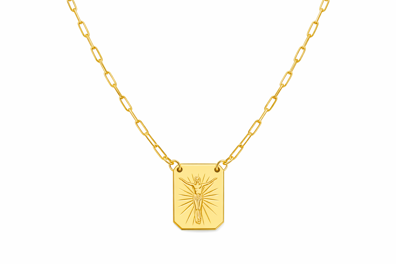 Este escapulário possui duas medalhas com a imagem de jesus e do crucifixo em extremidades opostas. A peça conta com banho em ouro 18k e acabamento polido, destacando os detalhes do relevo sacro com alta durabilidade para o uso contínuo.