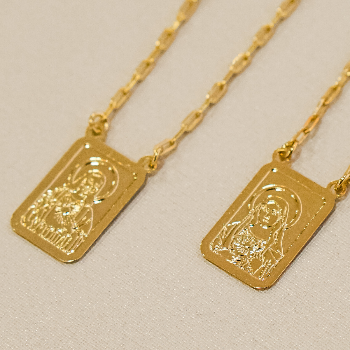 Este escapulário possui as tradicionais medalhas de Nossa Senhora e o Sagrado Coração de Jesus em extremidades opostas. A peça conta com banho em ouro 18k e acabamento polido, mantendo o design clássico religioso com alta durabilidade para o uso diário.