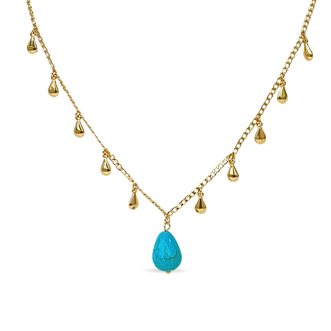 O Colar Gotas com Pingente Turquesa exalta a beleza orgânica e a sofisticação das pedras naturais. Seu design apresenta uma sequência delicada de gotas que culmina em um pingente central de pedra turquesa, valorizada por sua tonalidade vibrante e única. Uma peça marcante que une o frescor da cor turquesa ao luxo do acabamento dourado, perfeita para iluminar o visual com elegância e personalidade.