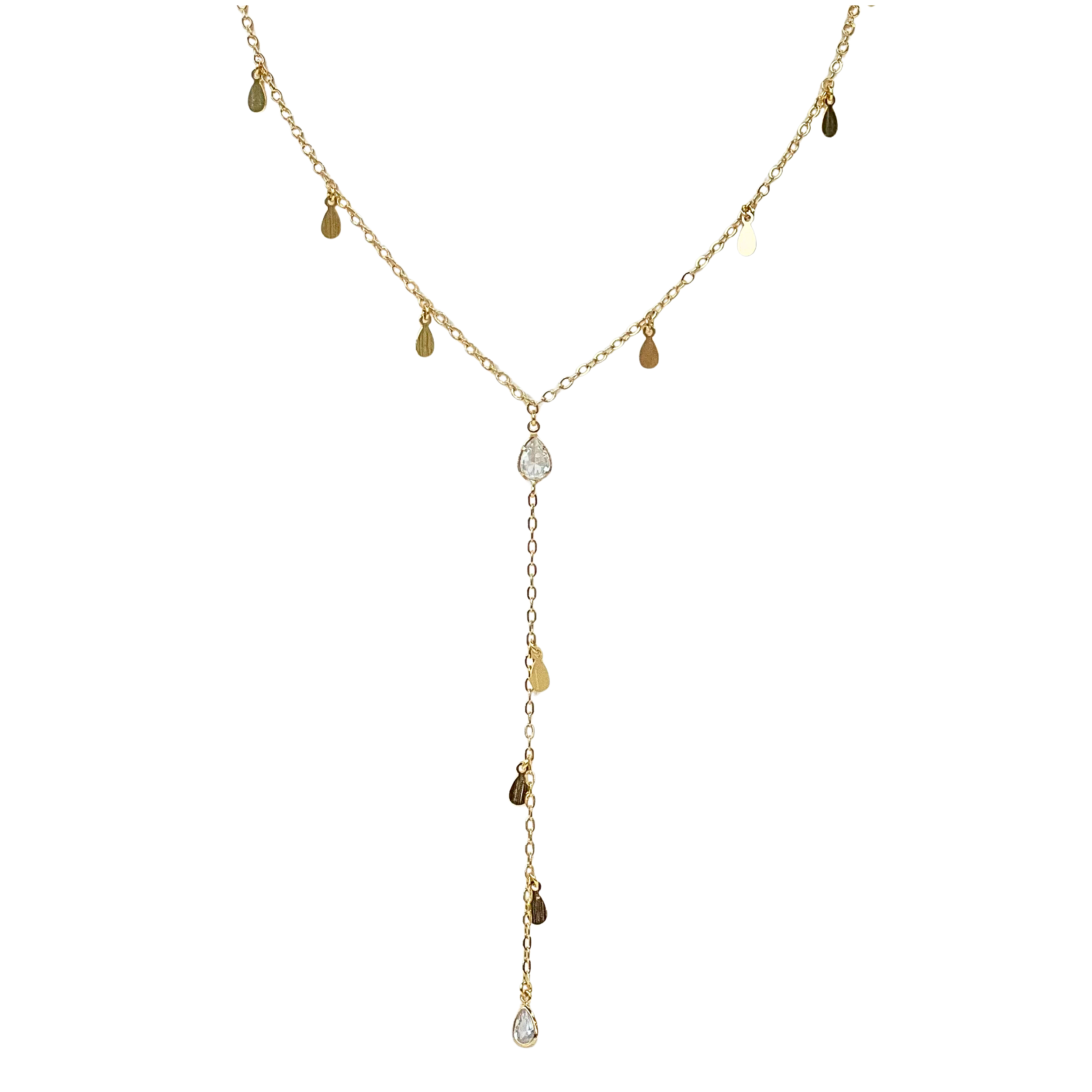 Colar modelo gravata com pingentes em formato de gota lisa e zircônias, que proporcionam equilíbrio perfeito entre delicadeza e brilho. Uma peça elegante e versátil, ideal para valorizar decotes e compor looks sofisticados.