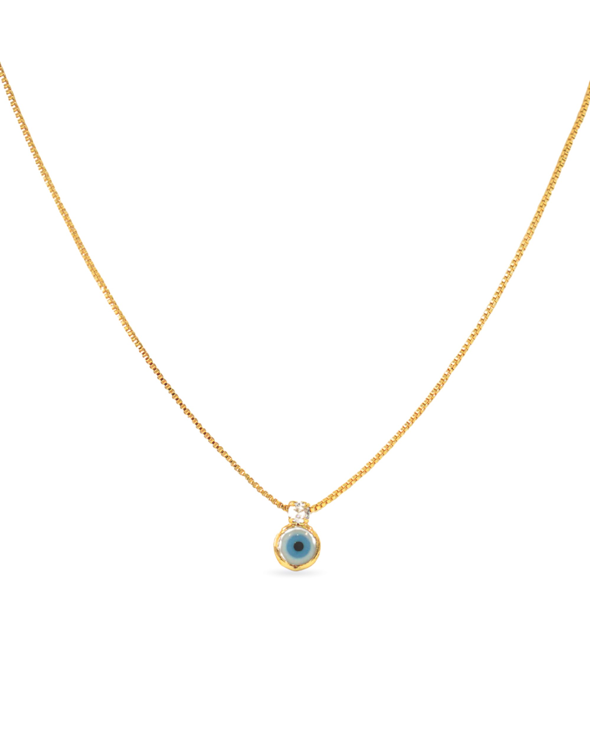 Este colar une proteção e sofisticação em um design delicado, apresentando o tradicional amuleto do Olho Grego, acompanhado por um brilhante ponto de luz em zircônia branca. A peça possui um luxuoso banho em ouro 18k, que destaca o contraste entre o azul vibrante do amuleto e o brilho cristalino da pedra.