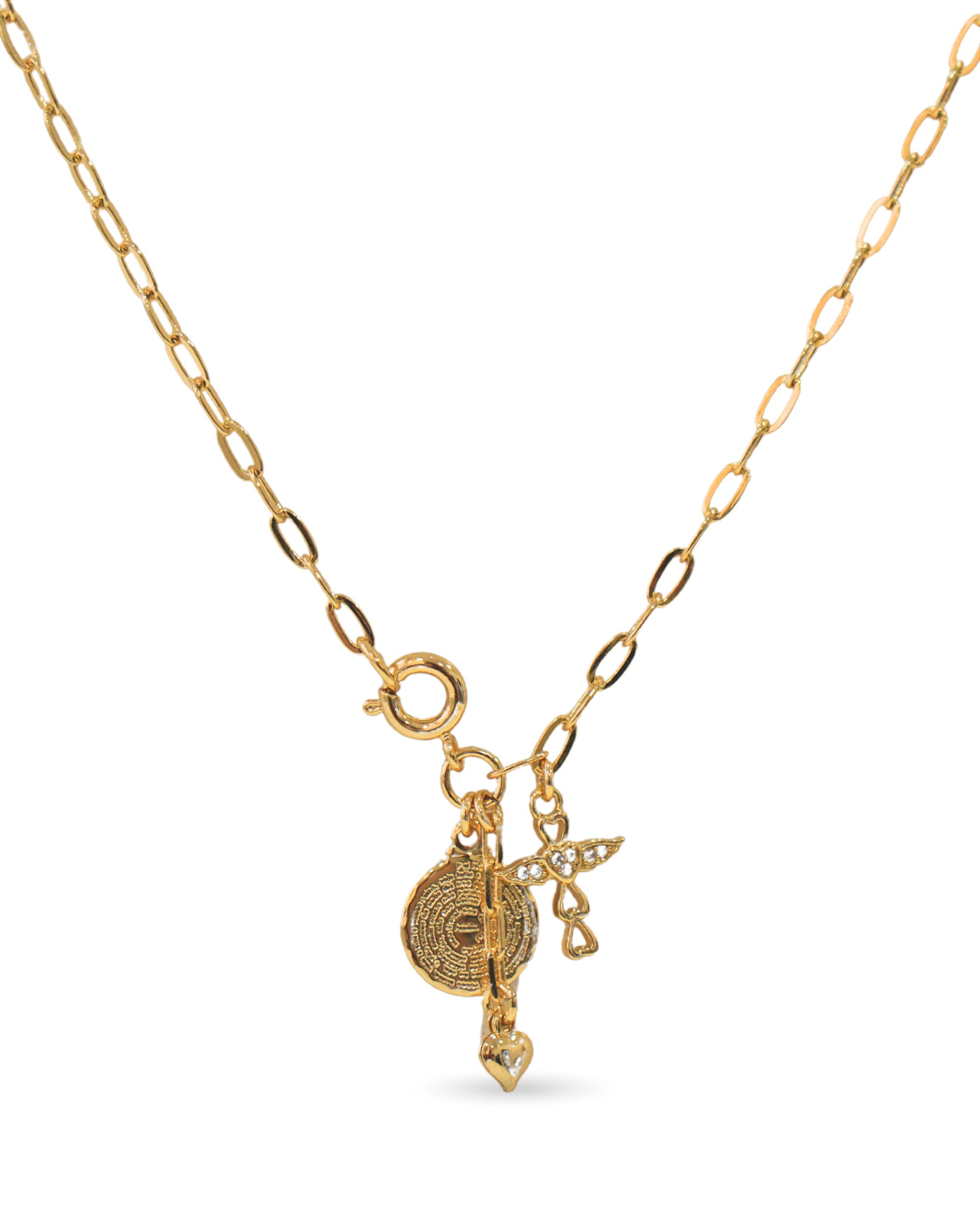 Este colar é uma peça de profunda devoção e elegância, apresentando uma medalha central com a oração do Pai Nosso gravada em baixo relevo. O design é enriquecido por pingentes delicados e uma cruz cravejada de zircônias brancas, que conferem pontos de luz sofisticados e um movimento gracioso à joia.