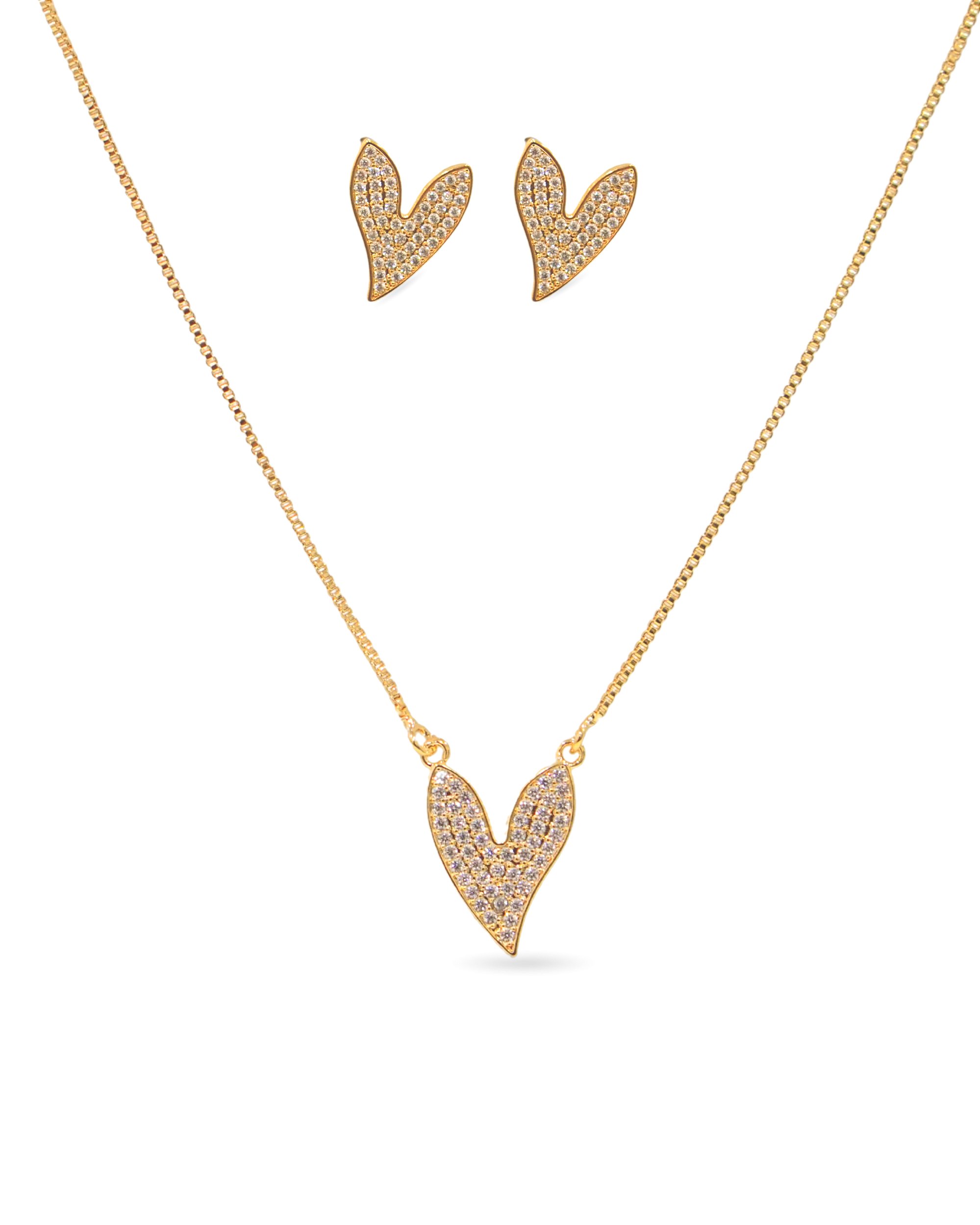 Este conjunto apresenta um design contemporâneo composto por um par de brincos e um colar com pingente em formato de coração assimétrico. As peças possuem a superfície cravejada de zircônias, conferindo um brilho contínuo e um visual elegante. É uma escolha que moderniza o formato clássico do coração, ideal para quem busca acessórios românticos com uma estética mais atual.