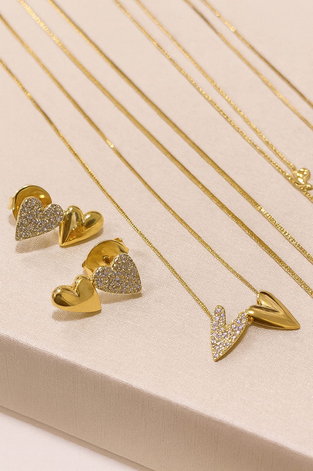 O Conjunto Duplo Coração é composto por brincos e colar com design delicado que combina dois corações, um com acabamento liso e outro cravejado em zircônias, criando um contraste sofisticado e cheio de charme.