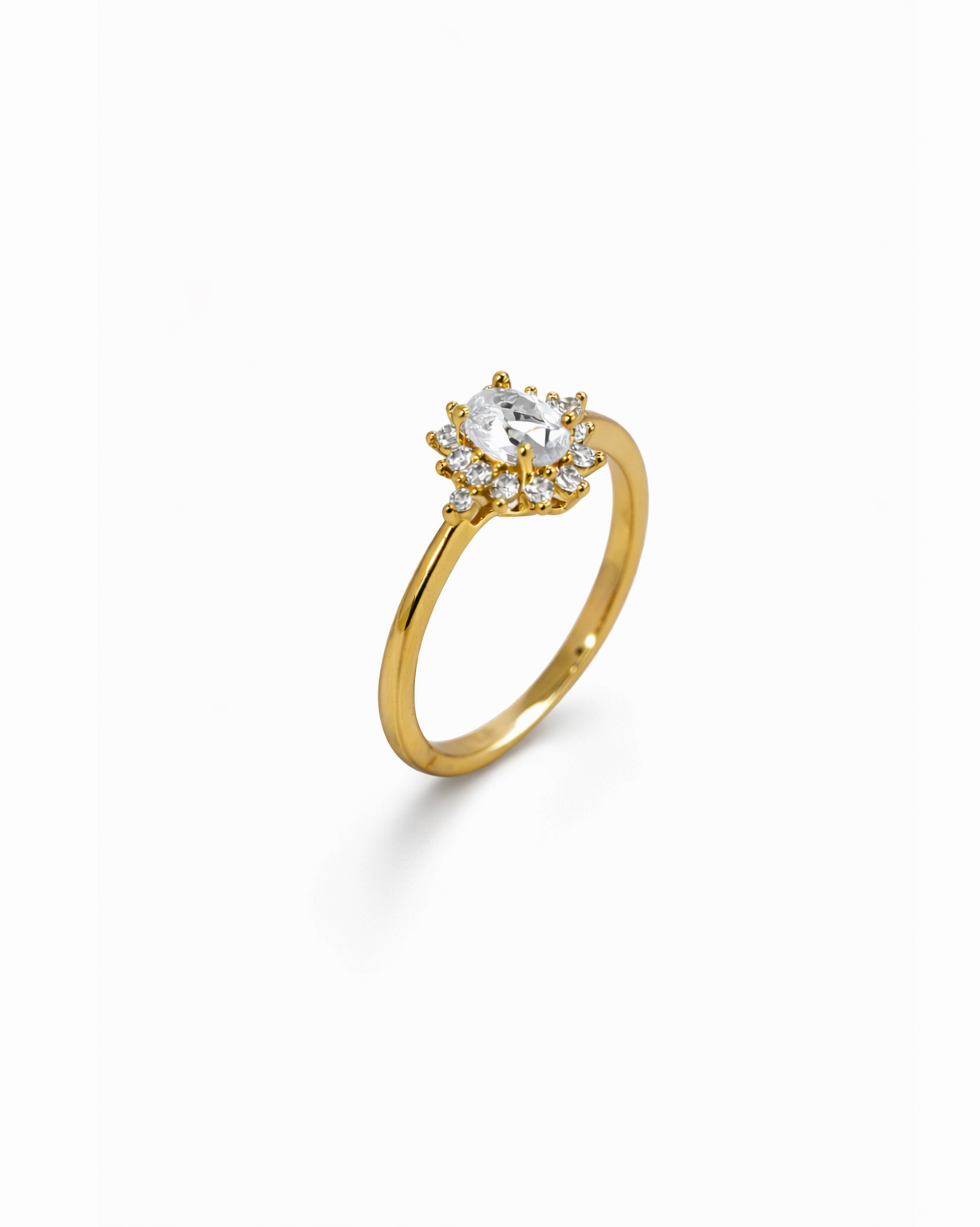 Este anel apresenta o clássico design chuveiro em formato oval, inteiramente composto por zircônias brancas (cristal) de alta transparência. A peça destaca uma pedra central proeminente circundada por uma moldura de microzircônias, criando um efeito delicado e que potencializa o brilho da peça. O aro possui acabamento polido, reforçando a estética romântica e atemporal do modelo.