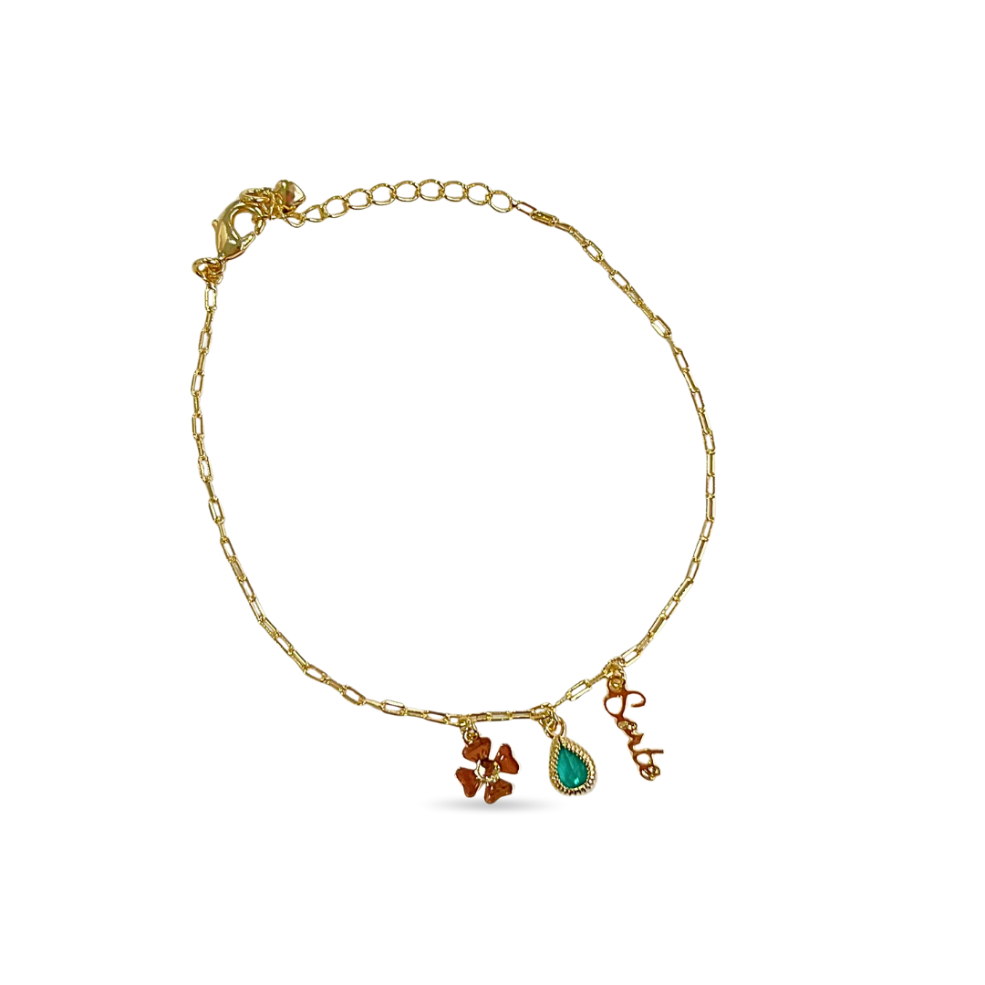 A Pulseira com Pingentes Zircônia Sorte une elementos clássicos em um design moderno e cheio de personalidade. A peça apresenta um trio de pingentes composto por uma zircônia verde de alta lapidação, um trevo delicado e uma medalha com a inscrição Sorte. O contraste do tom esmeralda com o banho em ouro garante uma estética refinada e vibrante.