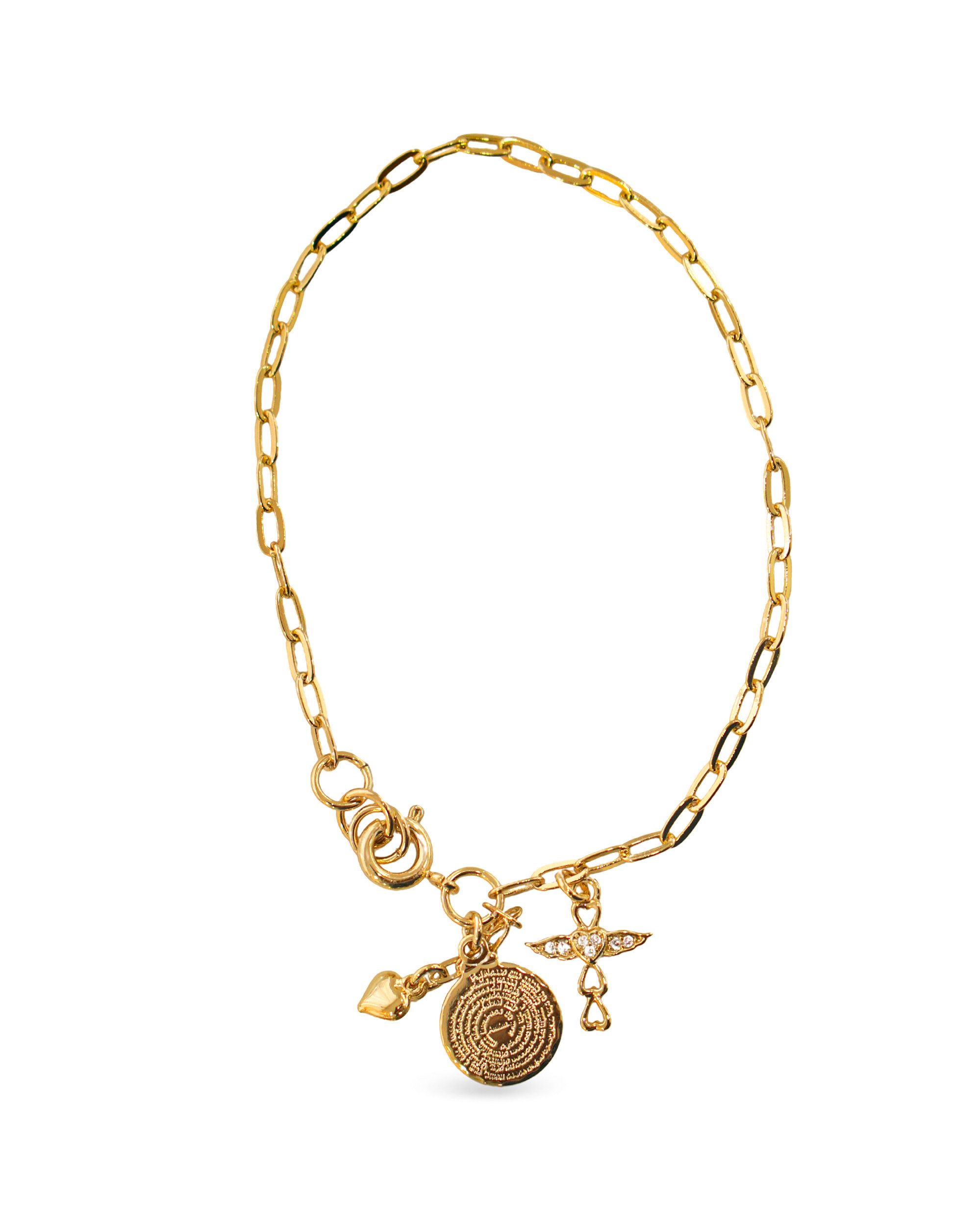 Esta pulseira é uma peça de fé e proteção, apresentando uma medalha central com a oração do Pai Nosso gravada com precisão. O design é adornado por pingentes religiosos e uma cruz cravejada de zircônias brancas, que conferem movimento e um brilho sofisticado ao pulso.