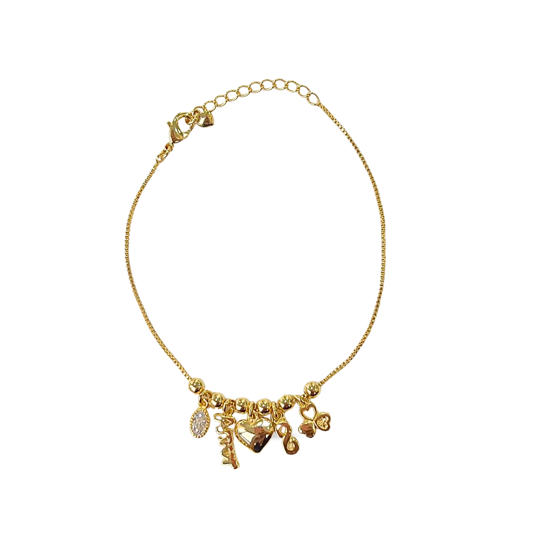 A Pulseira Pingentes Amor Ponto de Luz é uma peça repleta de significado e delicadeza. Seu design reúne símbolos clássicos como o coração, o infinito e o trevo da sorte, acompanhados por um pingente com a escrita "Amor" e um ponto de luz em zircônia. Uma semijóia encantadora e versátil, perfeita para expressar personalidade e estilo em uma única composição.